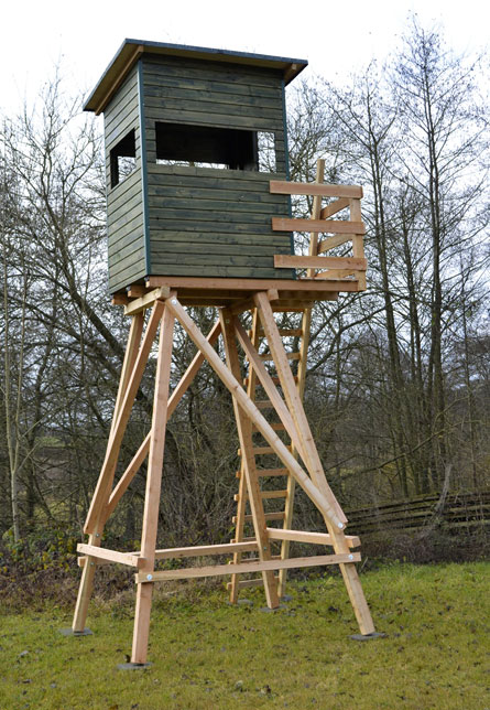 Unser Modell „Stegskopf XL“ ist für den Ansitz mit zwei Personen geeignet. Es handelt sich auch um eine offene Kanzel, d.h. sie hat keine Fenster und keine Tür. Ihre Außenmaße sind 1,20 x 1,50 x 2,00 m und mit einem seitlichen Podest 1,20 x 0,80 m mit Geländer. Dazu stehen verschieden hohe Unterbauten, mehrere Leiter- bzw. Treppenvarianten und Zubehör zur Auswahl.